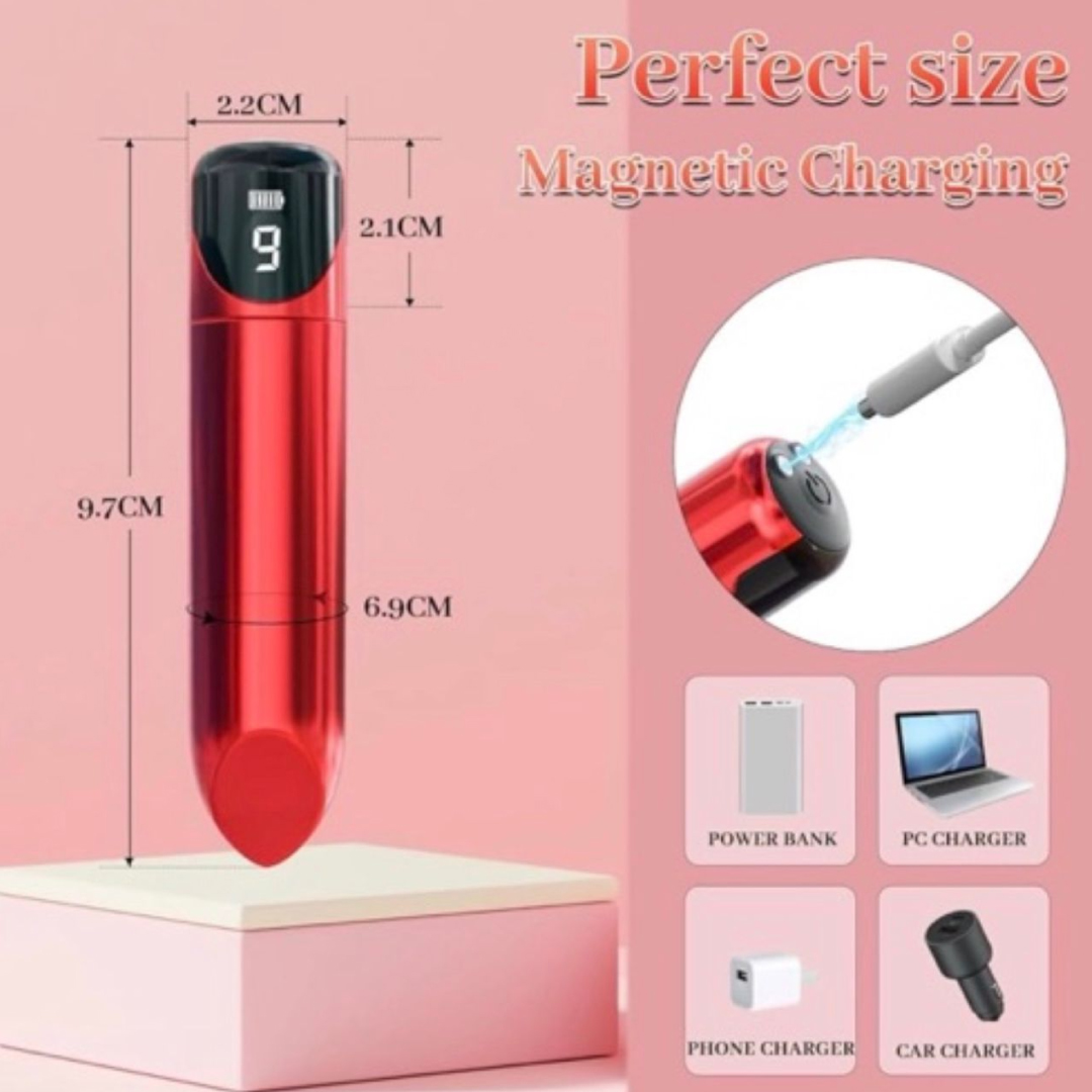 Pantalla Digital: Indicador LED que muestra el nivel de carga de la batería y el modo de intensidad (del 1 al 9). Potencia Personalizable: 9 potentes modos de vibración que van desde pulsaciones suaves hasta ritmos intensos. Diseño Ergonómico: Forma de bala con punta biselada para una estimulación precisa del clítoris y otras zonas erógenas. Carga Magnética USB: Sistema de carga por contacto, más higiénico y moderno, compatible con power banks, laptops y cargadores de pared. Material de Alta Calidad: Acabado metalizado suave al tacto y seguro para la piel. Resistencia al Agua: Diseño sellado que facilita la limpieza y permite su uso en entornos húmedos. |